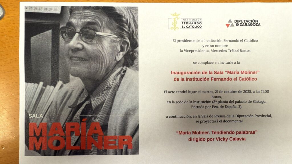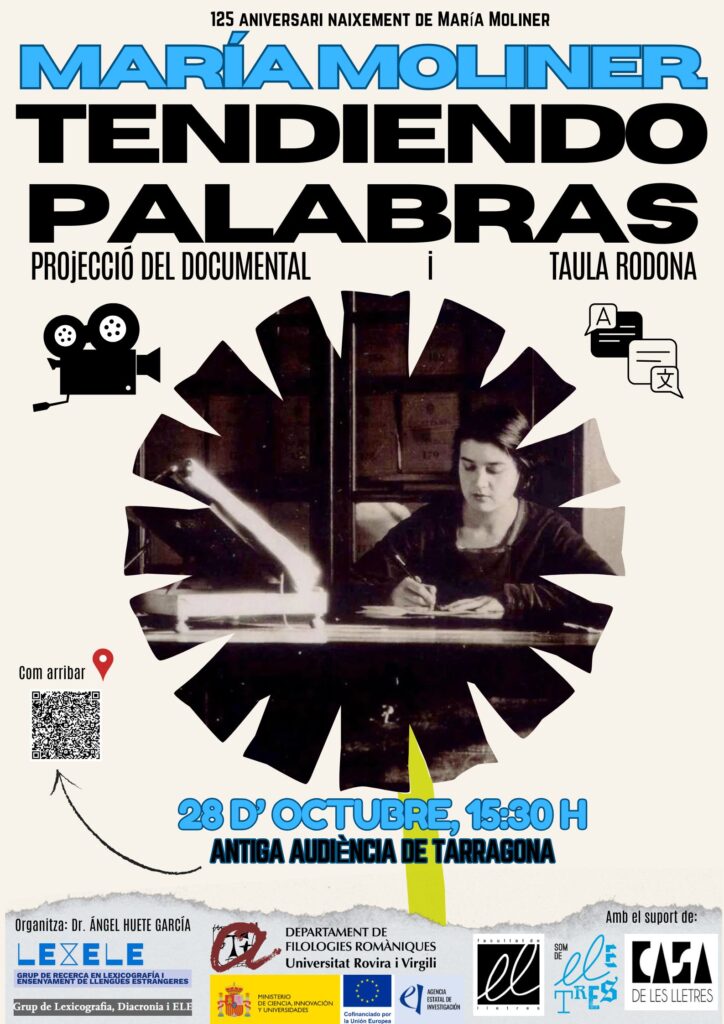 Con motivo del 125 Aniversario de María Moliner, se están realizando proyecciones del documental ‘María Moliner. Tendiendo palabras’ (Vicky Calavia). Este mes de octubre, en el que se celebra el Día de las Bibliotecas, se podrá ver en: